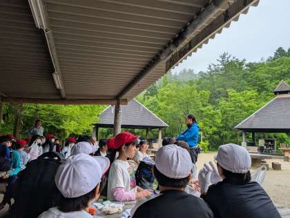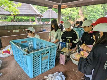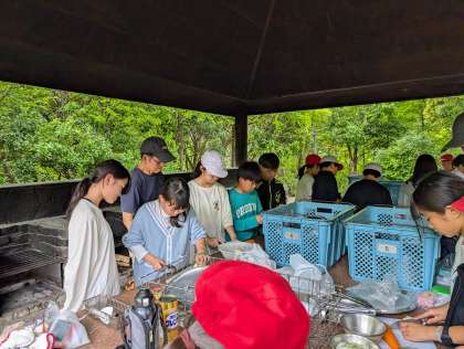 現在はカレー作りを行っています。少し雨が降っているようですが元気に頑張っています!、