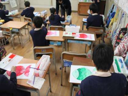 2−2は、水彩絵の具で、「ふしぎな魚」を描きました。同じ色で水の加減で濃淡をつくりながら、描いていきました。最後に目を描いて完成でした。