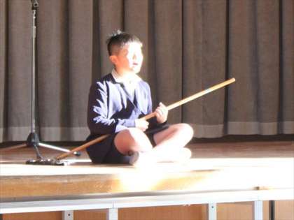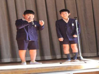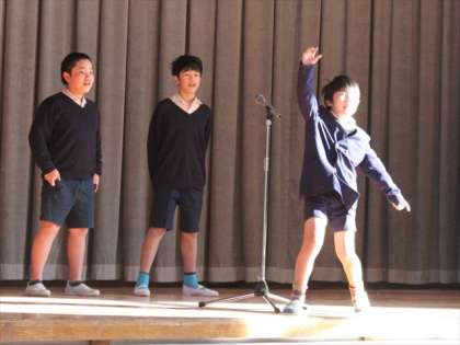 写真上(4−1海の声)TVコマーシャルで浦ちゃんが歌っている、あのイメージです。さんしんの代わりに、ほうきを使っているのが、おもしろいですね。写真中(5−1 ドラエもん)途中でドラエもんが、出てくるのがとても面白かったです。写真下(6−1 千の風になって)二人とも歌がうまくてびっくりしました。さすが6年生しめくくってくれました。