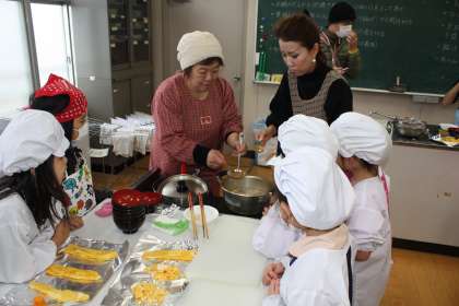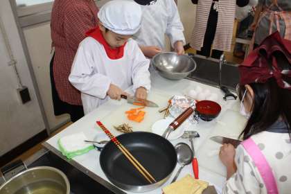 2月20日土曜日、家庭科室ではぐくみネット・生涯学習ルーム主催によるキッズキッチンがおこなわれました。今回作ったのは、豚汁とおにぎりです。大人に手伝ってもらいながらこわごわと包丁で切る子、慣れた手つきで野菜を刻む子、それぞれが楽しみながら活動していました。