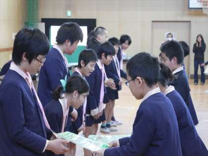 プレゼントの交換です。まずは、卒業生へ手作り写真カレンダーのプレゼントです。