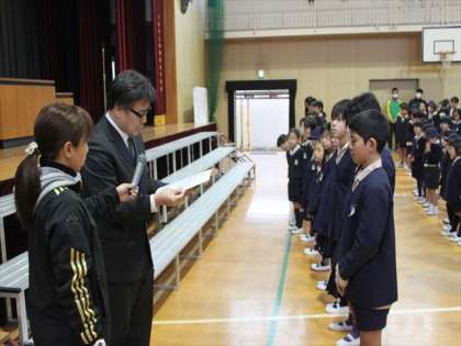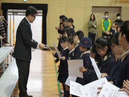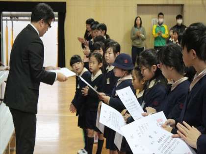 全大阪幼少年美術展の表彰がありました。19人の児童に表彰状が授与されました。