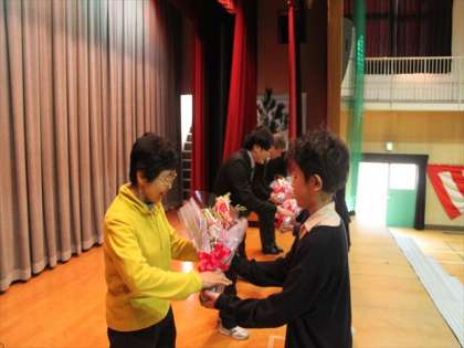 退職・転任する教職員の方々とお別れの会が開かれました。子どもたちの代表から花束が贈られました。