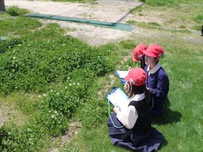 お天気も良く、虫めがねも使って、たっぷり観察しました。モンシロチョウやアゲハ、クマばち、かなぶんも顔を見せてくれました。