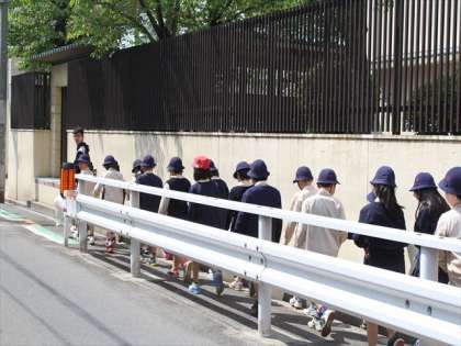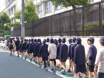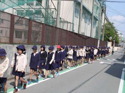 5,6年生が、午後から旧津守小へ「ちょこっと遠足」に出かけました。およそ8分ほどの道のりです。日頃学んだ交通安全ルールの路上演習ともいうべきものです。