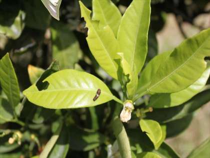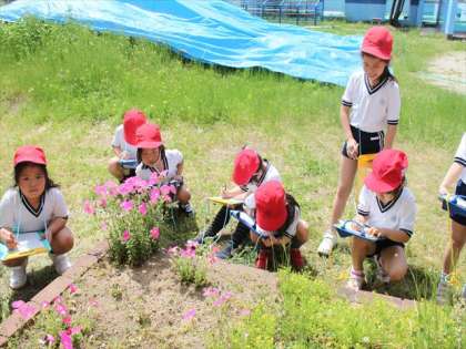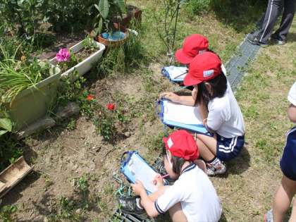 1年生2年生が旧津守小学校へ、ちょこっと遠足に出かけました。はじめは、「春見つけ」でした。ミカンの木には、アゲハちょうの幼虫がいました。まだまだ小さいのですが、初めて見る子たちは、びっくりしていました。