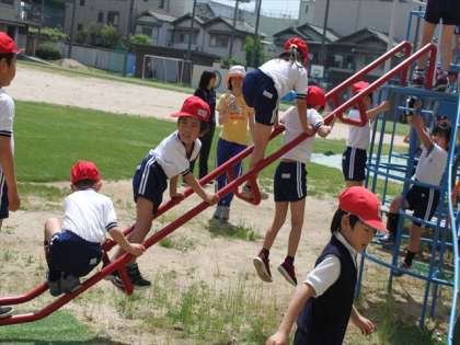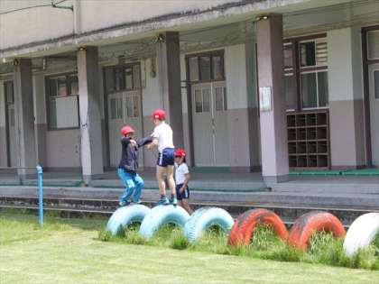 肋木(ろくぼく)のなかの基地に入ってキャーキャーはしゃいだり、タイヤの上でじゃんけんをしたり、終わった後はあせびっしょりの子どもたちでした。