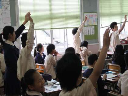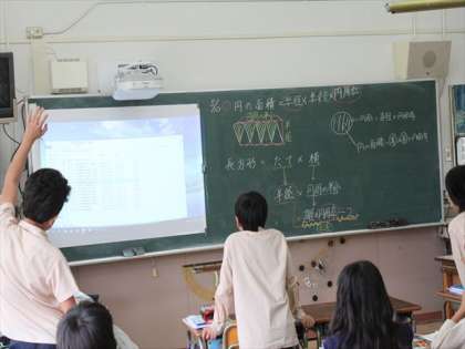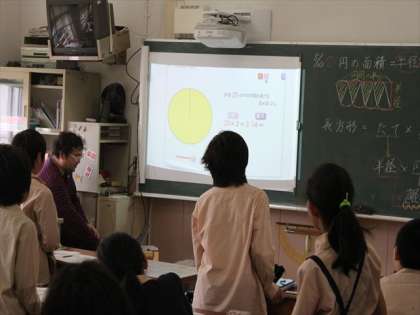 6年生が算数で「円の面積や円周」についてドリル学習をしていました。クイズ形式で、スクリーンに映った問題をどんどん解いていました。基本問題から少しひねった問題までたくさん解いていくうちに慣れていくのがよくわかりました。