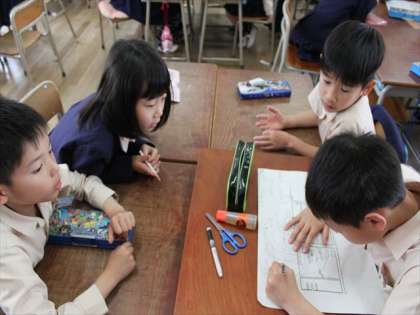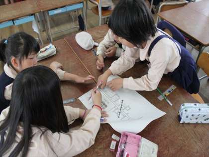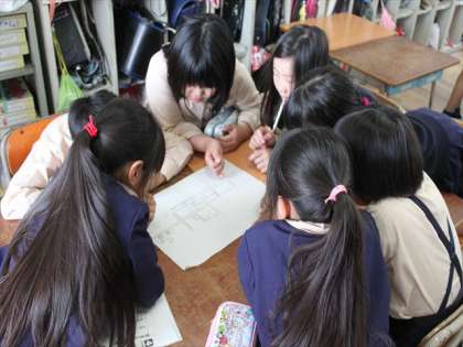 3年生が社会科で、「わたしたちの大好きなまち」という学習をしています。みんなで話し合って自分の家のまわりの様子を地図に表わそうとしています。ずいぶんわかりやすい地図も多かったです。あらためて自分の家のまわりに何があるか見に行っている子も多いようです。