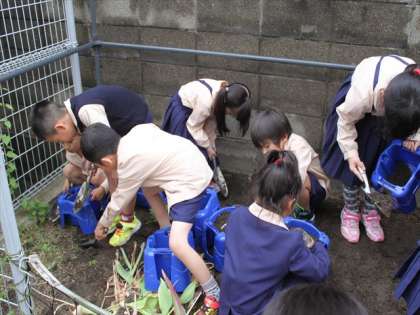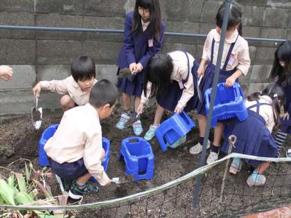 1年生が生活科で、あさがおのたねを植えました。教室で先生に土の入れ方、たねの植え方などを聞きました。次に一人用のプランターに土を入れました。学習園の土は、幼虫などもいて、あまり見たことのない子どもたちは、びっくりしていました。