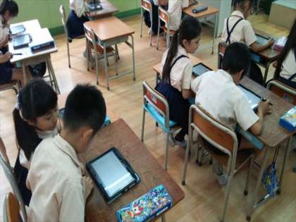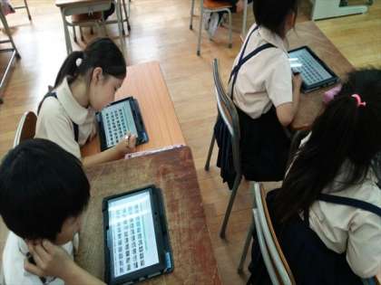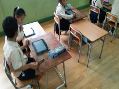 イメージを膨らませるために、タブレット端末を使って、たくさんの画像も見ました。子どもたちは、タブレットの使い方にすぐ慣れていきました。