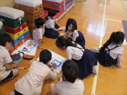 異なる学年でいろいろ相談する、工夫する、実際にやってみてさらに改善する・・・いろいろなことが学べます。コミュニケーションであったり、工夫する力であったり、知識を活用することに値打ちがあります。写真は、?ボックス、ボーリング、PKです。