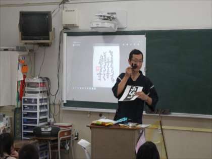 1年生が切り文字のゲストティーチャーの先生にご来校いただいて、切り文字を体験しました。1枚目は先生の作品です。全部つながっています。下書きもしないで切っています。すごいでしょ!