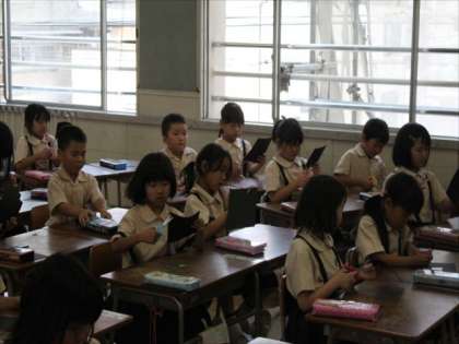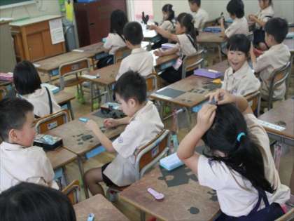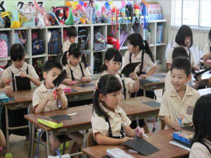 1年生は、はじめは、はさみの持ち方わたしかたを学び、四角、三角、まるを切りました。だんだん乗ってきていろいろ切るようになってきました。