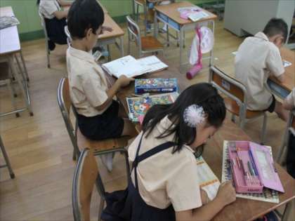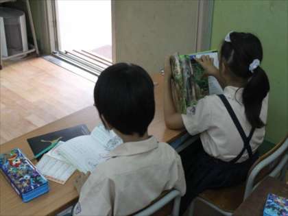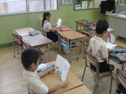 おとなりの2−1では、読書タイムで静かに子どもたちが本を読んでいました。西成区役所からいただいた読書カードに、読んだ本の名前などをきちんと記入していました。たくさん読んだ人には、区役所からご褒美がいただけるそうです。