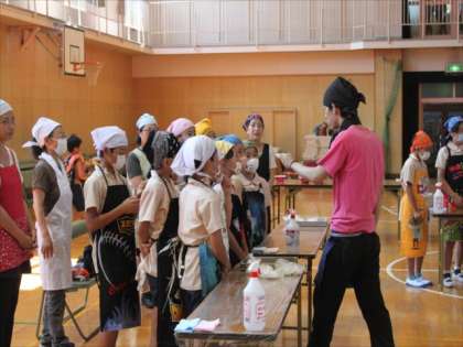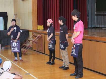 まず、「いただきます」「ごちそうさま」の意味や食べ物の話、お客さんに気持ち良く食事をしてもらうための衛生管理や心構えなどを教えていただきました。