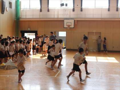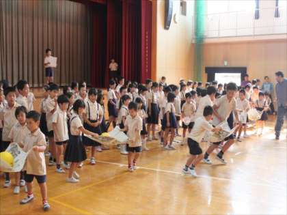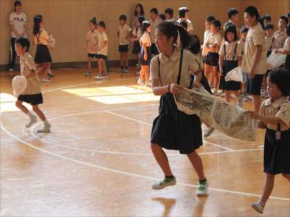 今朝の児童集会はボール運びリレーでした。たてわり班で2人ずつ新聞紙でボールを運びます。