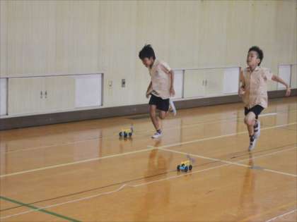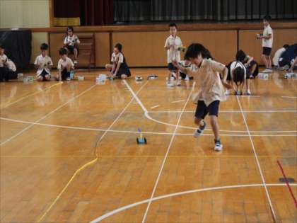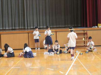 3年生が「風とゴムの働き」で風やゴムで動く車で実験をしていました。プロペラを手で回しながら、ゴムを巻いていきます。長く走る車は、20m以上走るそうです。