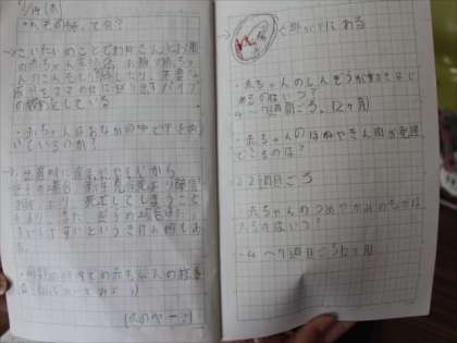 「赤ちゃんは、お母さんのおなかの中でどんな向きでどんなしせいか?」「赤ちゃんの骨や筋肉は、いつごろできるか?」「「つめや髪の毛はいつごろはえるか?」・・などたくさんの疑問が浮かんできたようです。