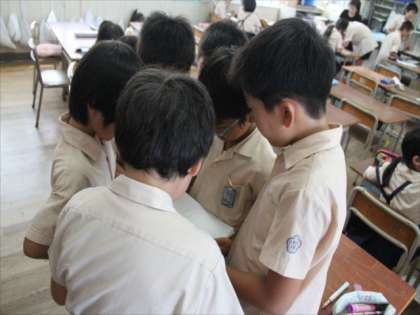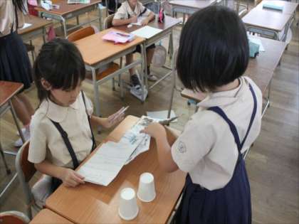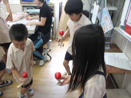3年生が、お楽しみ会の準備をしています。それぞれが出し物をするそうです。「コント、お笑い」(上)マジック(中)けん玉(下)グループごとに練習をしています。
