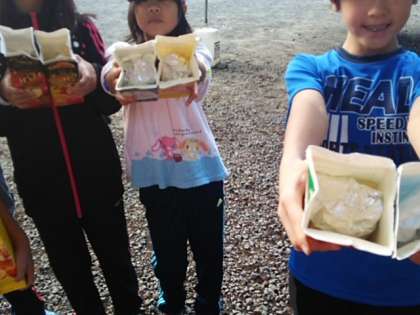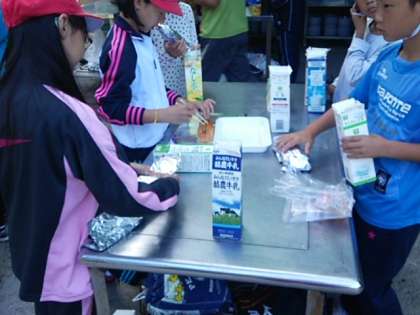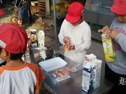 朝食は、簡単にいうとホットドッグです。パンにキャベツとソーセージをはさんでアルミホイルでくるみます。それを牛乳パックに入れて火をつけて焼きます。