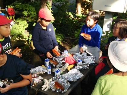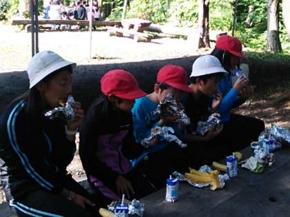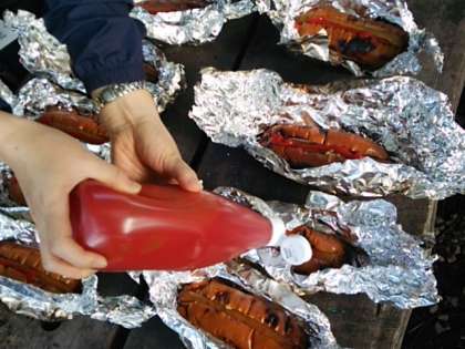 カートンドッグは、バナナ、牛乳といっしょにいただきます。ホットドッグにお好みでケチャップをかけます。