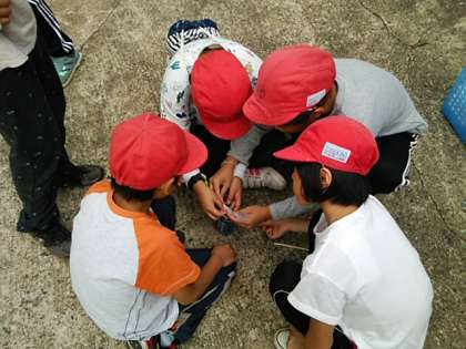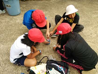 カートンドッグは、大成功!美味しかったです。部屋のそうじ、荷物移動を終えました。次は、シャーベットづくりです。空き缶にジュースと砂糖を入れて、密閉します。