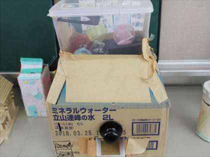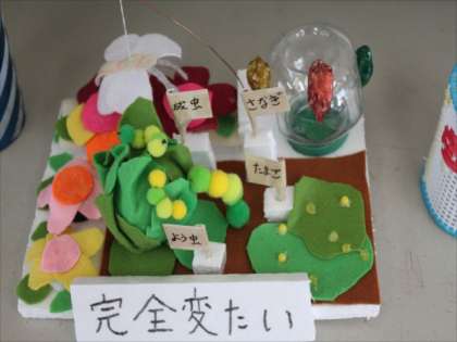 教室をまわると。子どもたちが夏休み中に取り組んだ自由研究や、作品が展示されています。いくつかご紹介します。(本当は全部紹介させていただきたいのですが、申し訳ありません。)写真上(ガチャガチャ)写真中(バーベキュー)写真下(昆虫の成長の様子)
