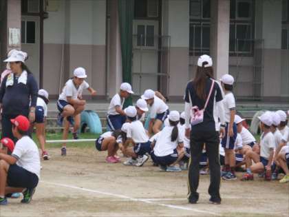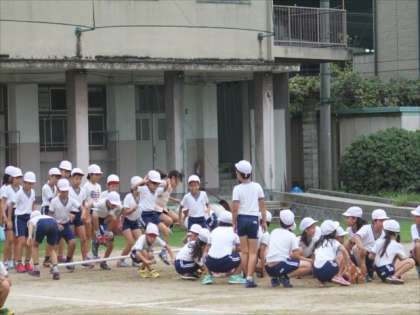 何度か練習するうちに、こつをつかみ、ました。最後の赤対白対抗台風の目リレーは、抜きつ抜かれつのいい勝負でした。どうしたらうまくいくのか、子どもたち同士がコミュニケーションをして工夫することがカギとなります。