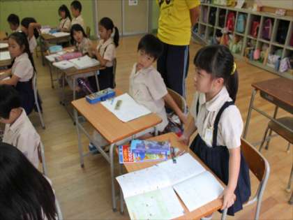 2−1で教育実習の先生の授業がありました。3けたの数と2けたの数のたし算、ひき算の学習です。どの児童も、しっかり話を聞いて、積極的に手をあげて発言していました。