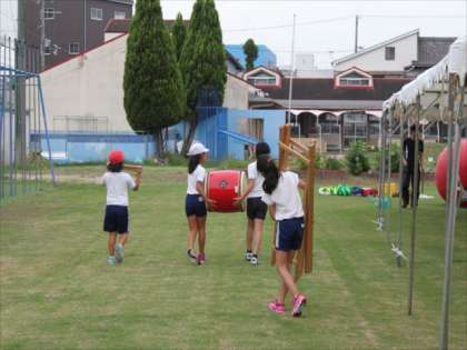 明日土曜日は、雨が予想されているため、予定を変更して今日の6時間目に運動会の準備をしました。運動会で使用する体育用具や長椅子を準備する4,5,6年生です。