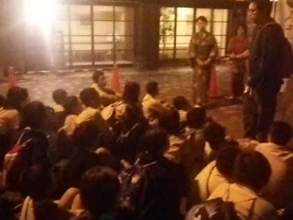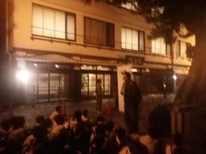 宿舎の大石屋さんに到着し開舎式をしました。いただきますの前のユーモアたっぷりのコメント発表で夕食が始まりました。