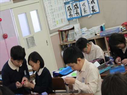 5−1では、家庭科の実習でした。2つあなボタンをつける学習です。玉結び、玉止めなども学習していますので、うまくはじめから最後までできるでしょうか?