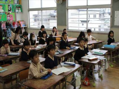 タブレットとプロジェクターを使っての電子紙芝居です。写真上中1−1「おさるのジョージ」写真下4−1「三つのたから」