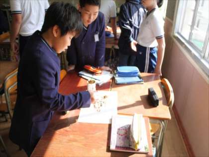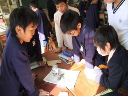 6年生が、3種類のアルミ缶を使って、わりばしの燃焼の実験をしました。アルミ缶は、3種類とも上は、空いています。ア、そのままわりばしを入れて燃やす。イ、下の方にあなをいくつか空けて燃やす。ウ、アのアルミ缶に上からふたをかぶせて燃やす。