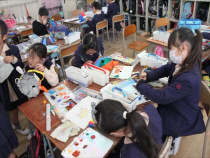 3年生がすてきな「お面」の仕上げに入っています。新聞紙と和紙ではりこのようにお面をつくって乾燥させました。