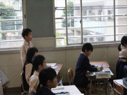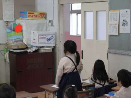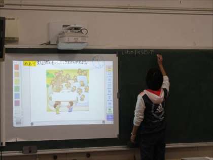 1年生が算数で「文しょうだいをつくってしきをかんがえよう」というめあてで学習をしました。スクリーンに映された何匹かのおさるさんを使って問題をつくりました。木の上のおさるや岩の滑り台のおさるの数を足したり引いたりして問題をうまく作っていました。