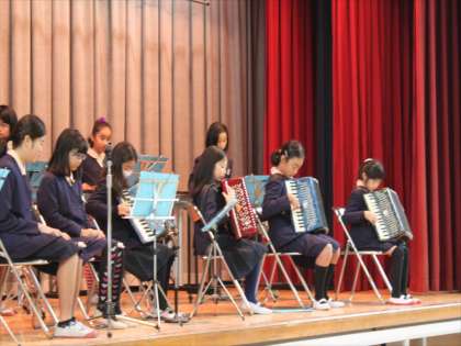 竣工式で、音楽クラブが「情熱大陸」を演奏します。これまで、一生懸命練習してきました。全校児童の前でリハーサルをしました。