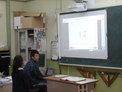 1人が先生にスクリーンに出してもらった九九を解いています、