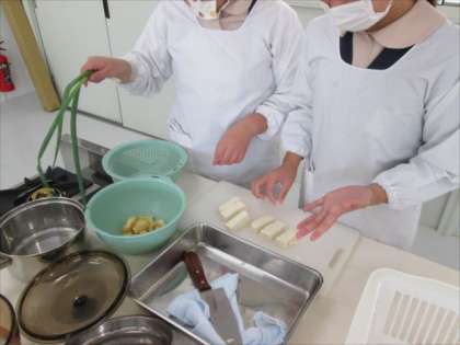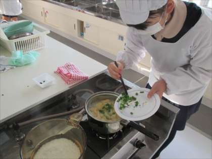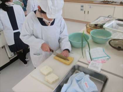 これまで家庭科室がなかったので、先週に引き続き調理実習です。今回は、ごはんとお味噌汁です。お味噌汁の具は、油揚げ、ねぎなどです。