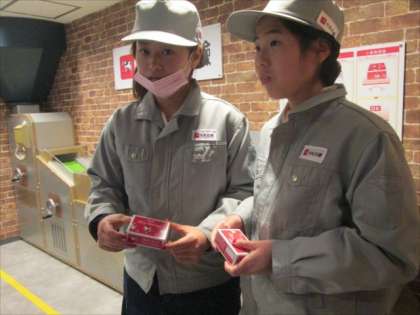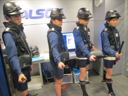 写真上(警備会社体験)なかなか似合っています。写真中(せっけん工場体験)