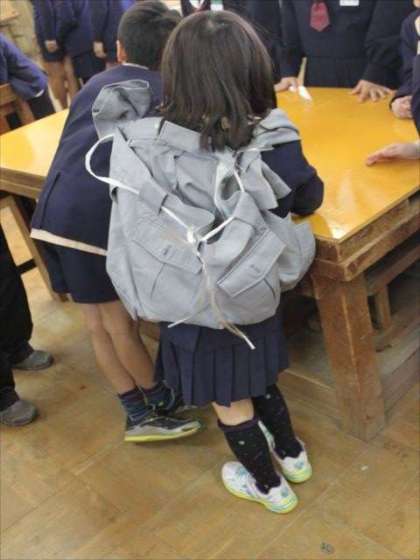 写真(ズボンでつくるナップザックです。中学生のお兄さんお姉さんにていねいにおしえてもらいました。)