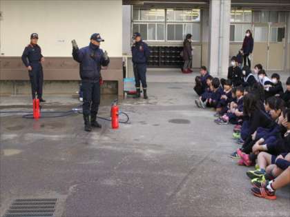 水消火器の体験学習です。ピンを抜いて消火薬を火元にかけるのが短い時間でできることが大切です。