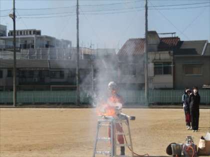 消防署の方が天ぷらなべの危険性を実験してくださいました。まちがって水をかけると爆発的に燃え上がることがわかりました。ふたやぬらしたタオルで空気を遮断することが有効だそうです。