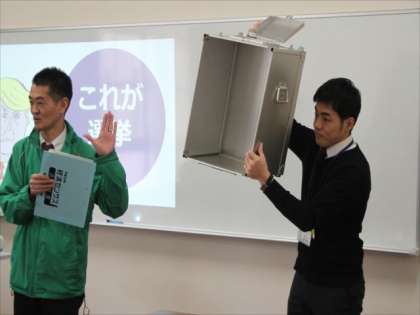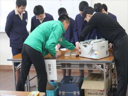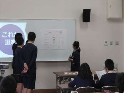 開票についても学びました。投票用紙は、特殊な紙を使っていて、投票箱に折って入れても中で開くようになっているそうです。開票の時に開く手間を省くためだそうです。「夏休みを長くする」という候補が当選しました。(区のマスコット4人が立候補していました。)