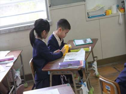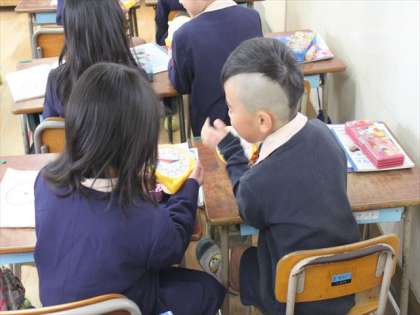 全体で時計の読み方を確かめてから、昔ながらの算数用の時計で、友達と問題を出し合っていました。すぐに読めるようになるためには、毎日の修行が必要です。
