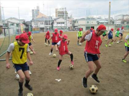 サッカー型のゲームをみんなで楽しもうをめあてにサッカーを楽しむに必要な技能や態度を学んでいます。