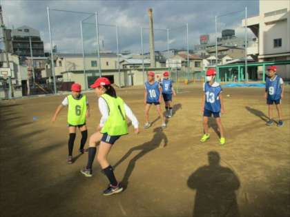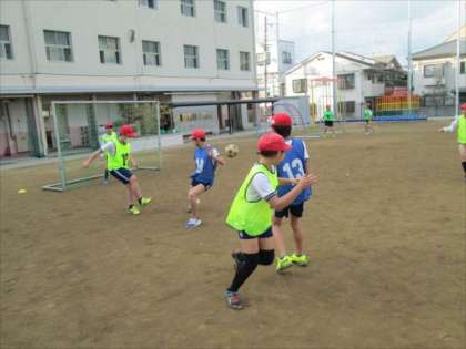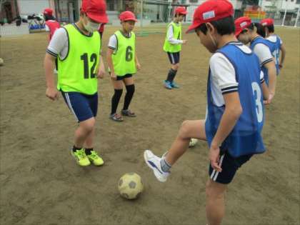 「一歩でボールに1回さわるドリブル」と「ボールと一緒に走るドリブル」「方向を変えるターン」などを学習しました。パスを受ける人が、「うれしくなるようなパスをしよう」なども学習しました。