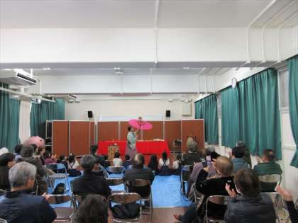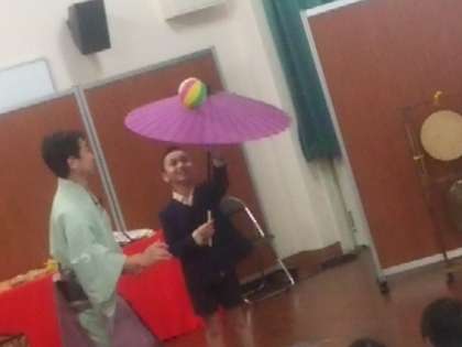 次の出し物は、曲芸で傘の上でまりを回したり、棒の上に物をのせてバランスをとったりの芸で、この頃には大泣きだった子たちもにこやかに全員戻って来ていました。見ていた大人の方々は、「かわいいなあ・・」という声が思わず出ていました。