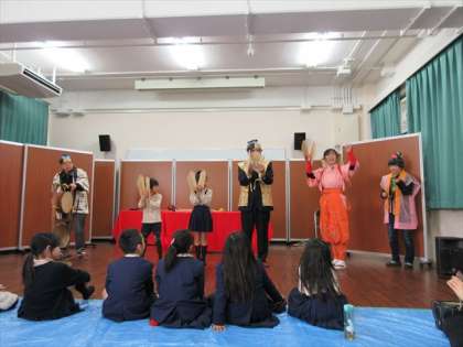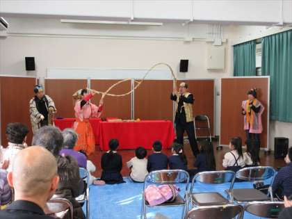 4つ目の出し物は、南京玉すだれという曲芸でした。子どもたち、地域の方や校長先生も仲間に入れられて、色んな形をつくっていました。最後は皿回し体験でした。お世話してくださった生涯学習ルームの皆様本当にありがとうございました。子どもたちも地域の皆さんも大喜びでした。